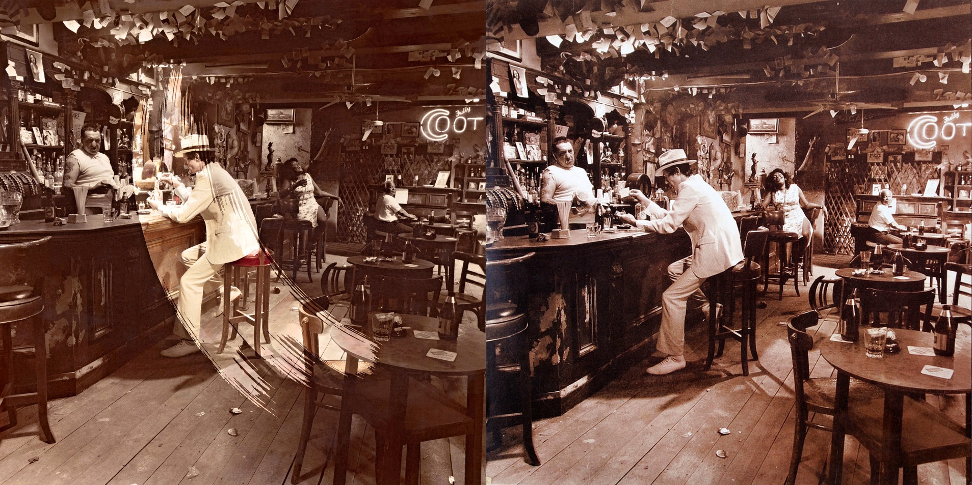 Celá scéna byla připravena nedaleko Londýna v ateliéru filmových studií Shepperton, jehož stěny byly pokryty stovkami zažloutlých vizitek a dolarových bankovek ve snaze věrně kopírovat tehdejší interiér restaurace Old Absinthe House na 400 Bourbon Street v New Orleans.