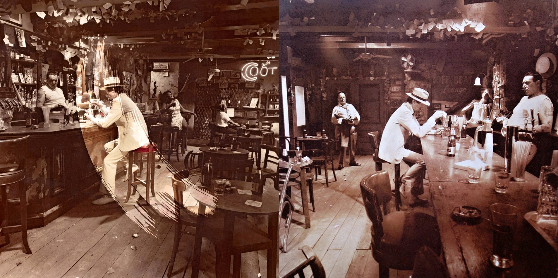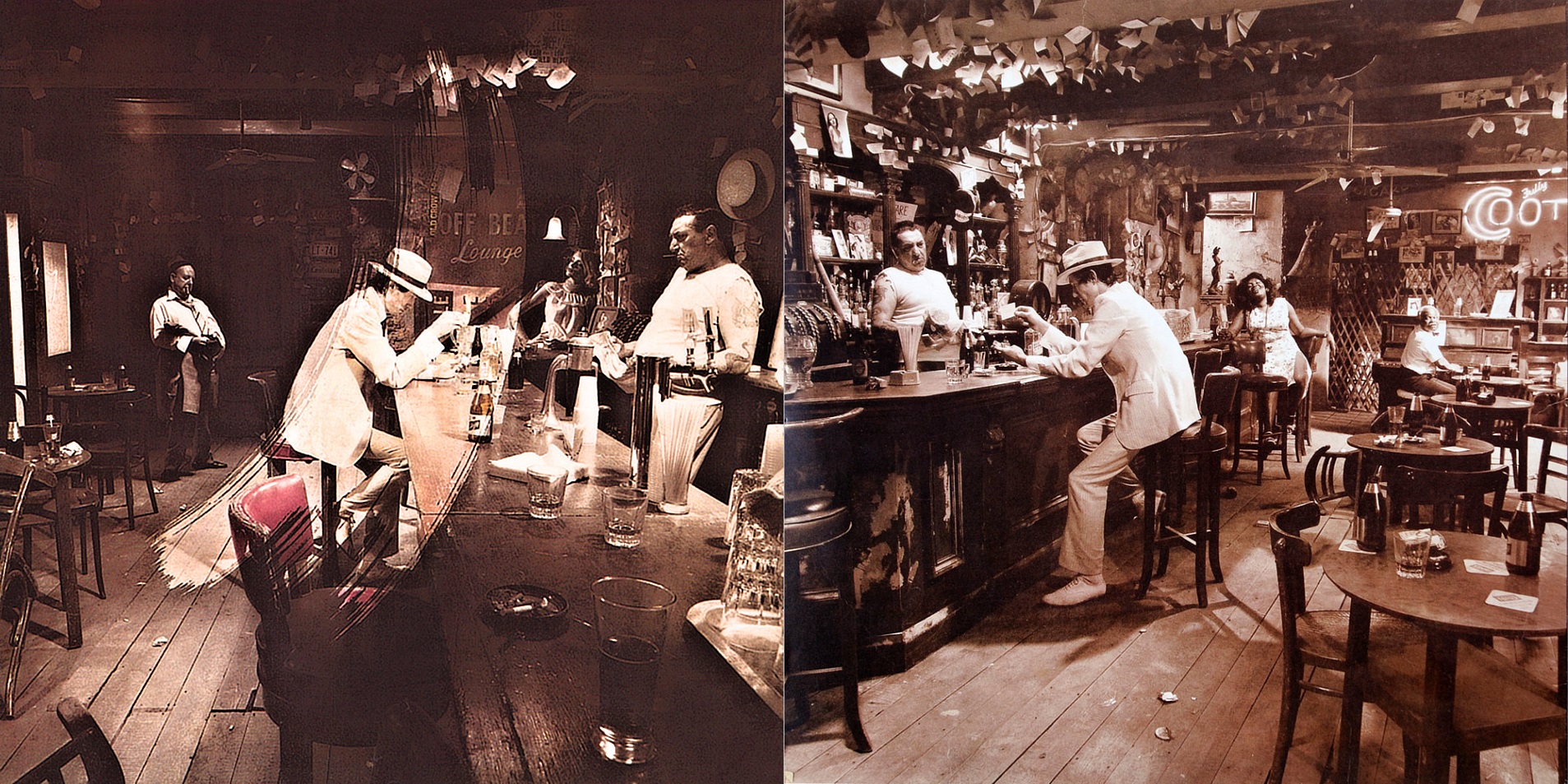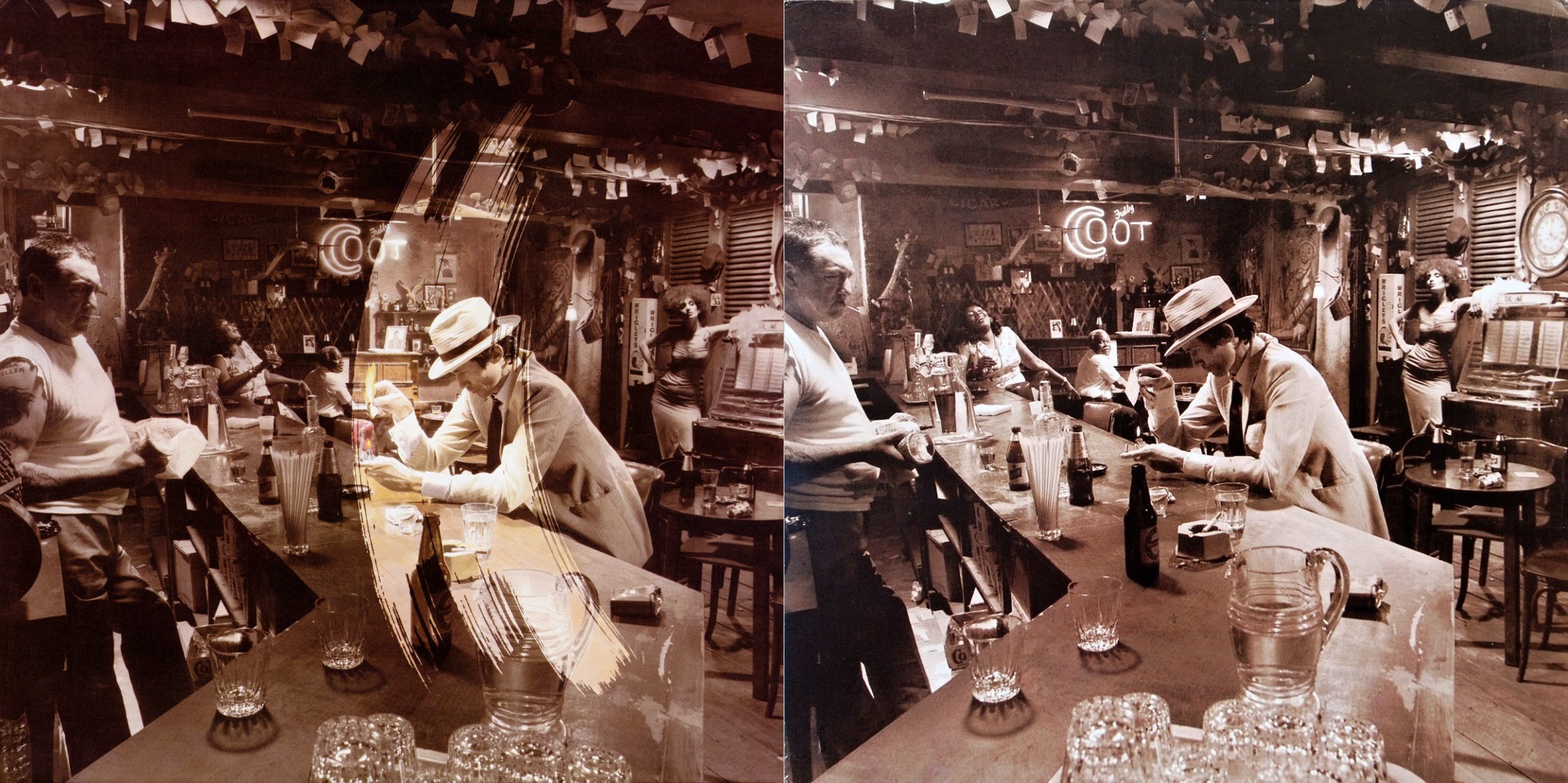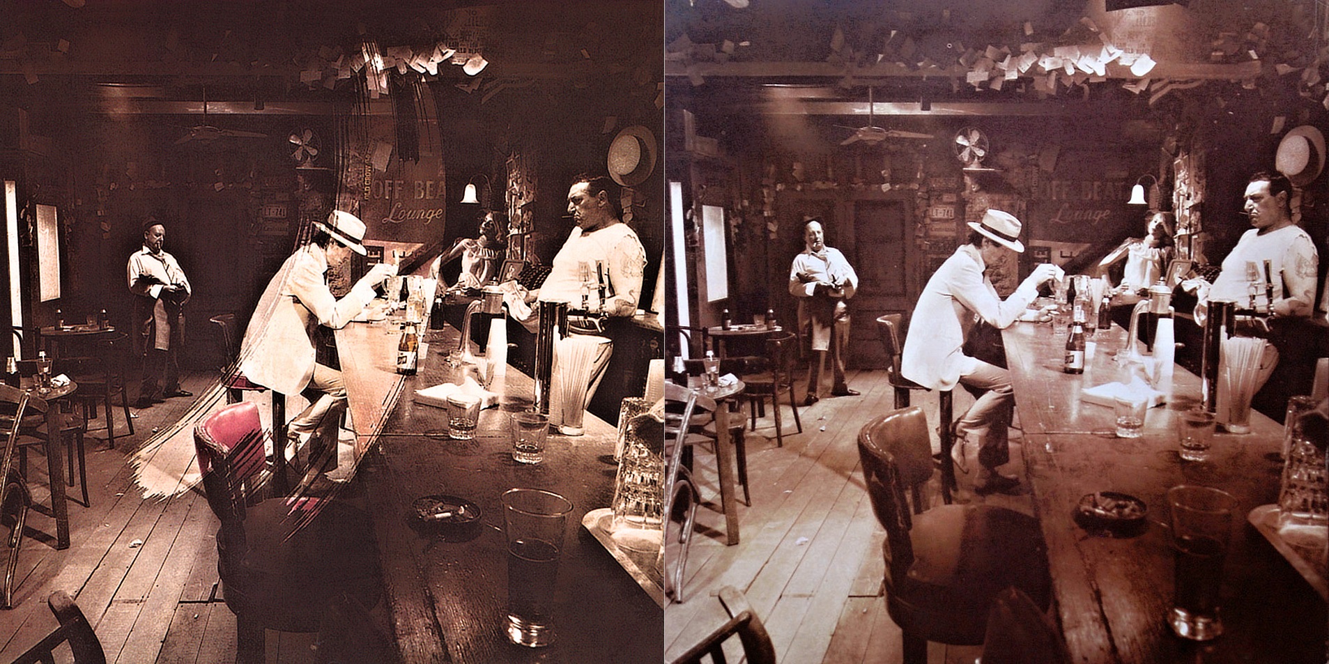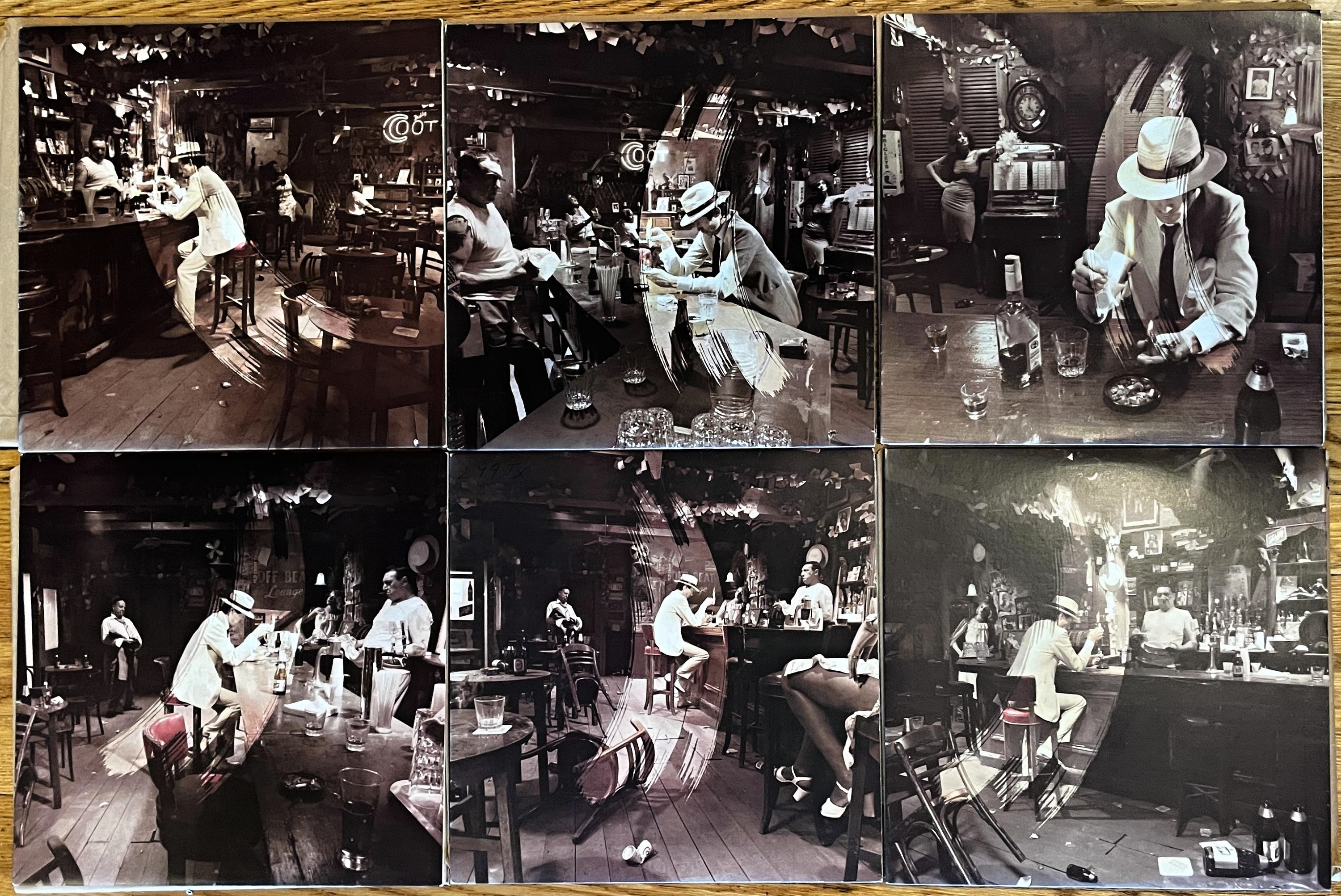 Album se nabízelo v hnědých papírových sáčcích s potiskem obsahujícím strohé základní údaje pro lepší orientaci prodejců, takže fanoušci před rozbalením neměli šanci poznat, jakou že verzi si odnášejí domů. A jen pokud měli štěstí na variantu B nebo E, mohli z obou fotografií na obalu dát dohromady kompletní osazenstvo baru. Za mě v současnosti jasná volba při nákupu původního vydání LP již zbaveného momentu překvapení.