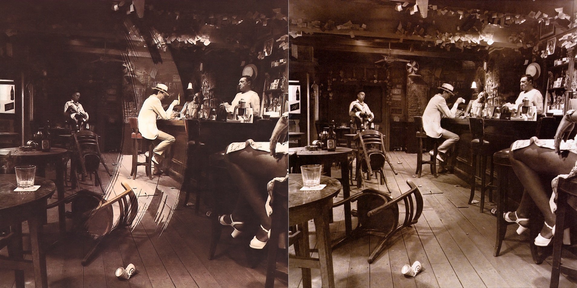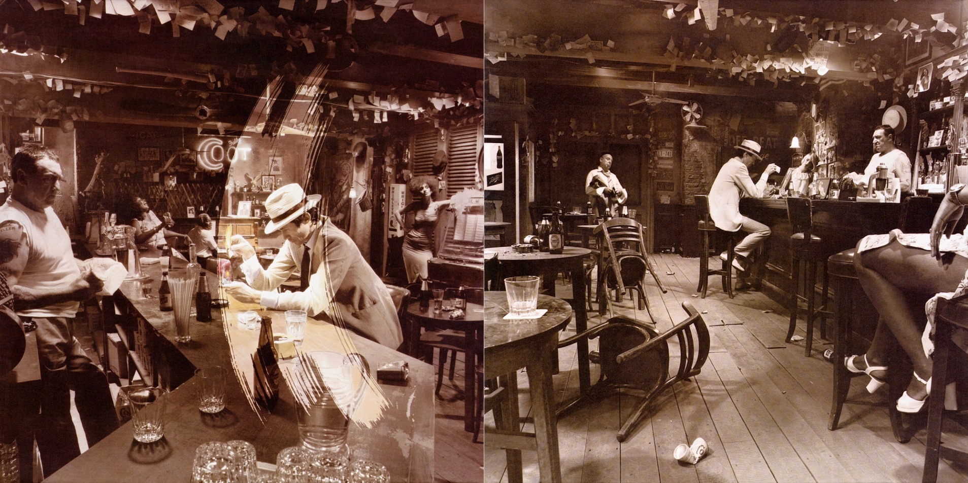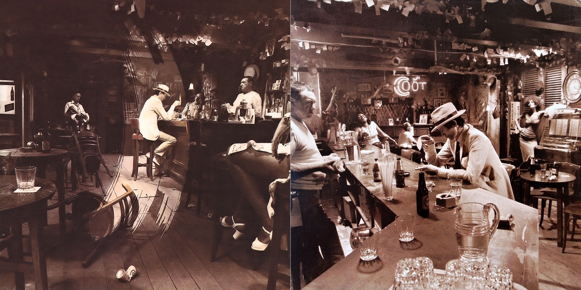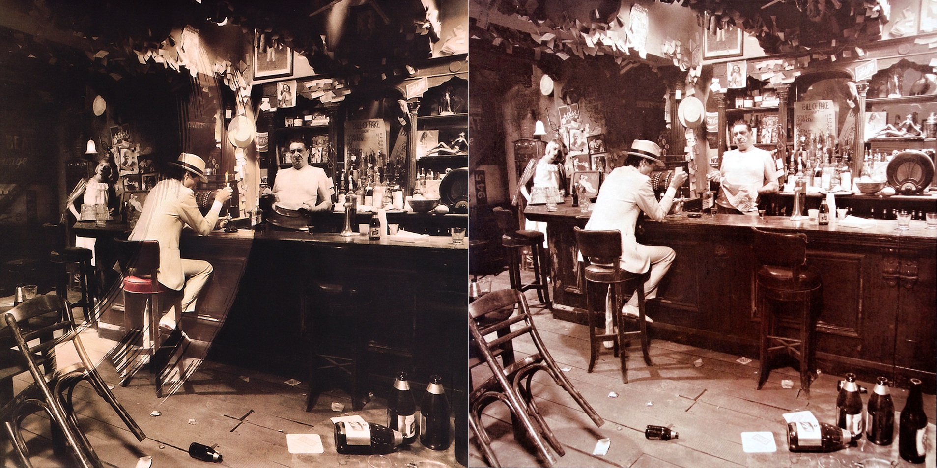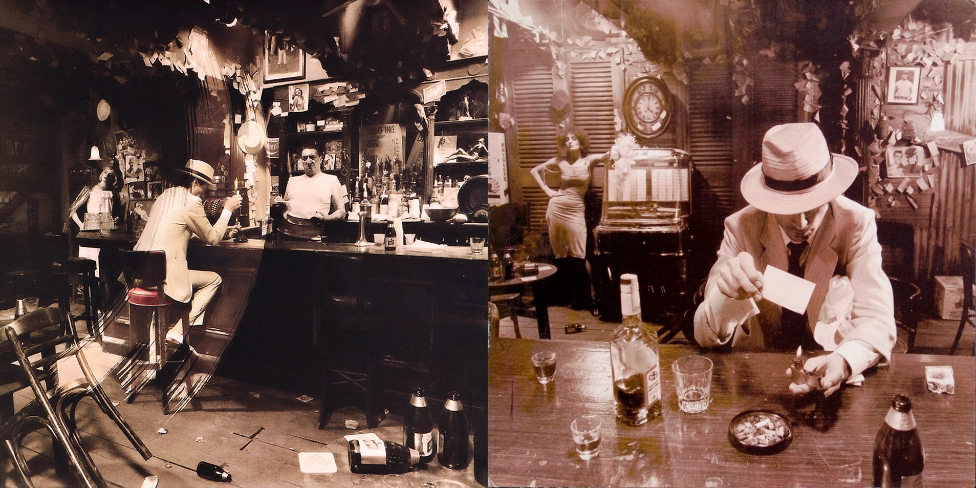 Album se nabízelo v hnědých papírových sáčcích s potiskem obsahujícím strohé základní údaje pro lepší orientaci prodejců, takže fanoušci před rozbalením neměli šanci poznat, jakou že verzi si odnášejí domů. A jen pokud měli štěstí na variantu B nebo E, mohli z obou fotografií na obalu dát dohromady kompletní osazenstvo baru. Za mě v současnosti jasná volba při nákupu původního vydání LP již zbaveného momentu překvapení.